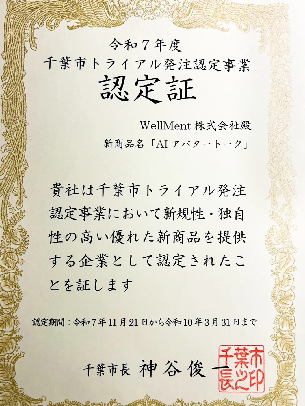 WellMent株式会社は、千葉市が実施する「令和7年度千葉市トライアル発注認定事業」において、当社の新商品「AIアバタートーク」がトライアル発注事業に認定され、神谷俊一千葉市長より認定証を授与されました。