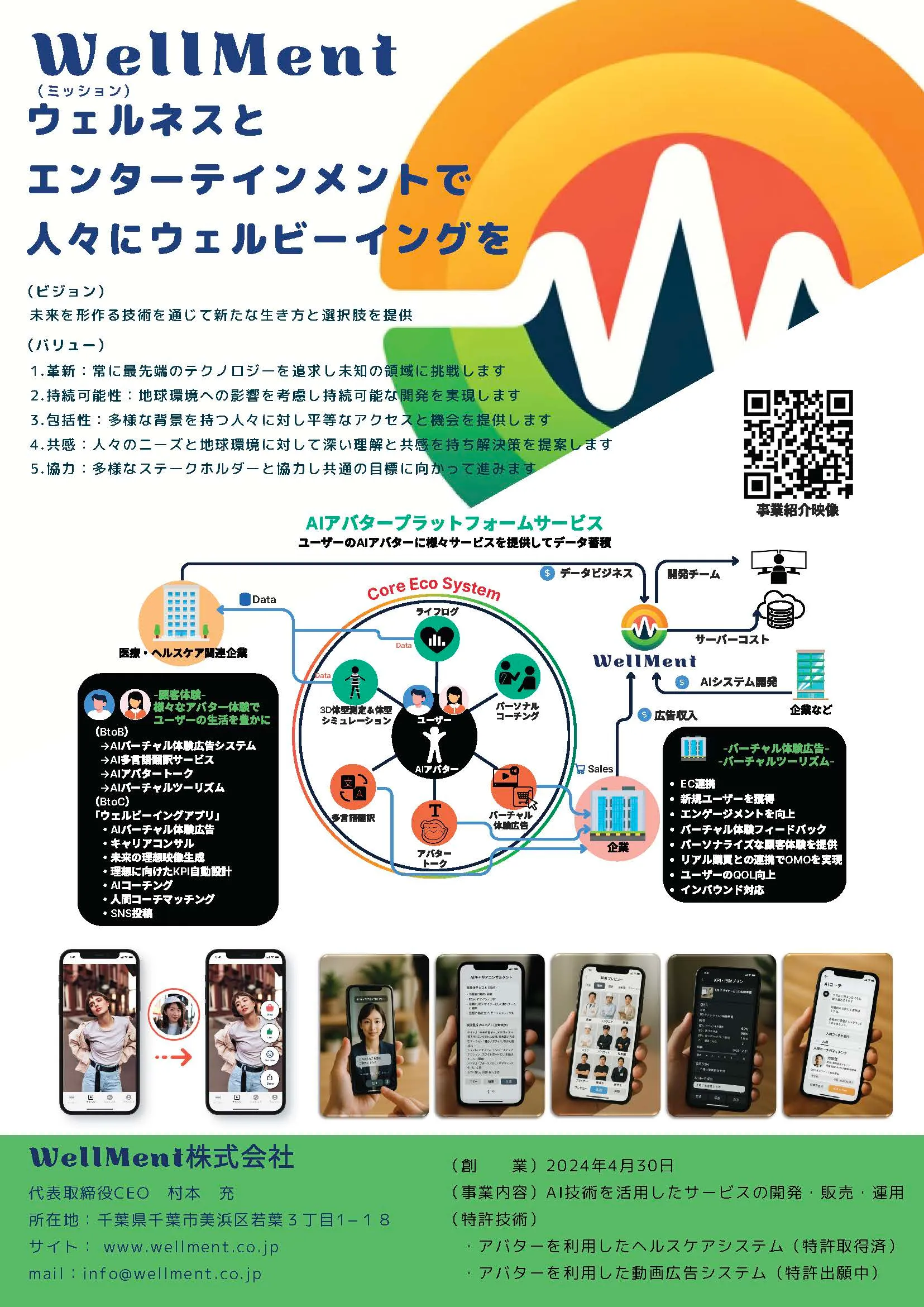 『ベンチャー・カップCHIBA』において、WellMentの「ウェルビーイングを体現するアバタープラットフォームサービス」が、AI・IoT賞を受賞いたしました。ご支援とご期待に感謝申し上げます。新たな挑戦への原動力とし、さらなる技術革新と社会貢献に尽力いたします。