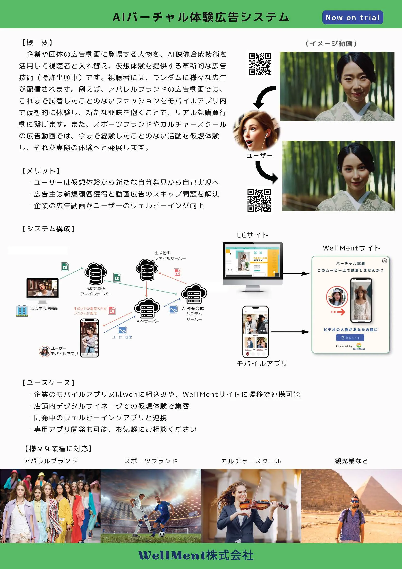 WellMent株式会社は、スタートアップ都市推進協議会主催の「JAPAN STARTUP SELECTION」のチャレンジ枠に千葉市代表として選出されました。全国から選抜された31社の一つとして、1月30日に首都圏企業とのイベントに参加いたします。本イベントを通じて、当社のAIバーチャル体験広告システムの革新的な技術を広く発信してまいります。