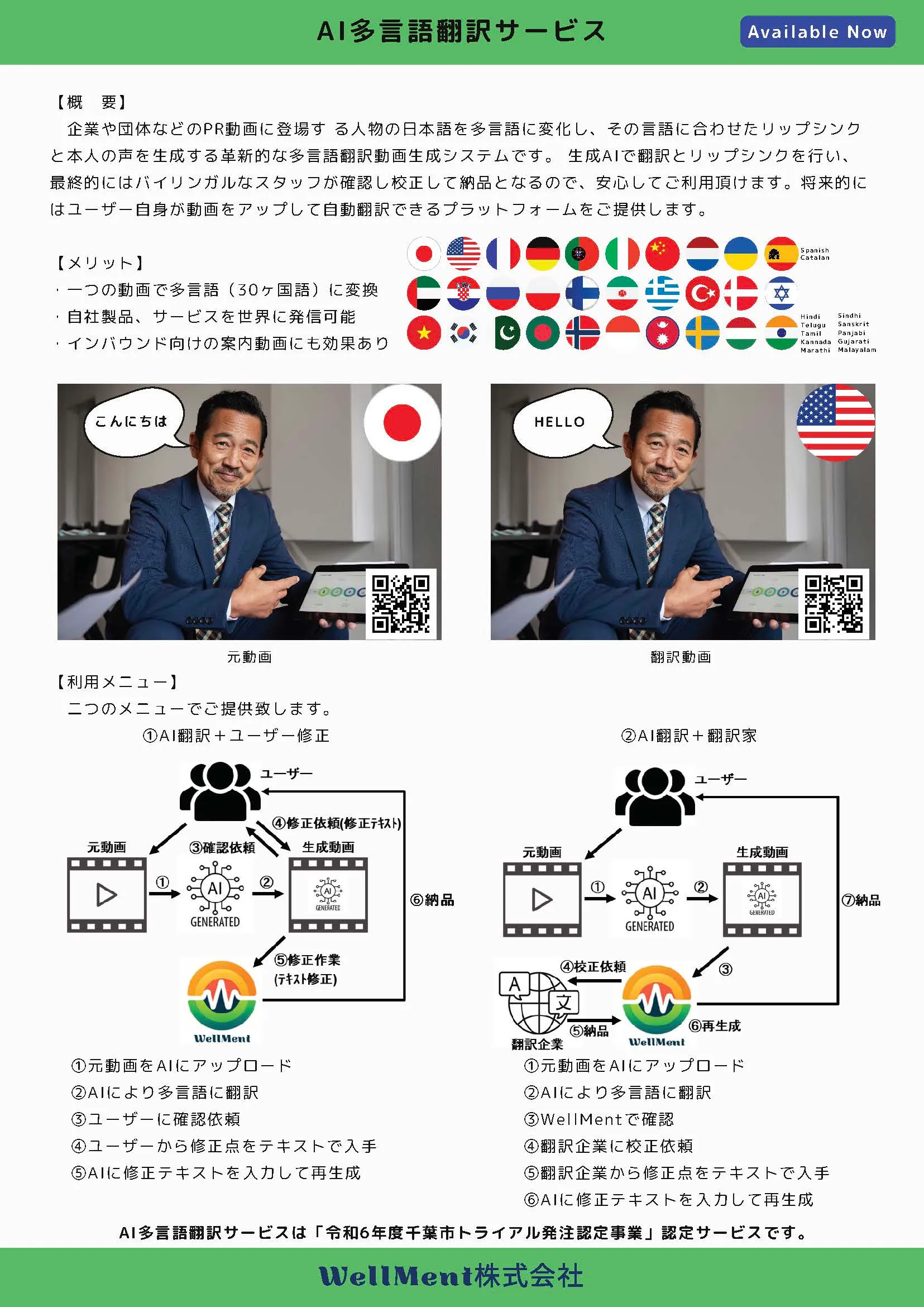WellMentの「AI多言語翻訳動画生成サービス」が、千葉市の令和6年度のトライアル発注認定事業に選定されました。