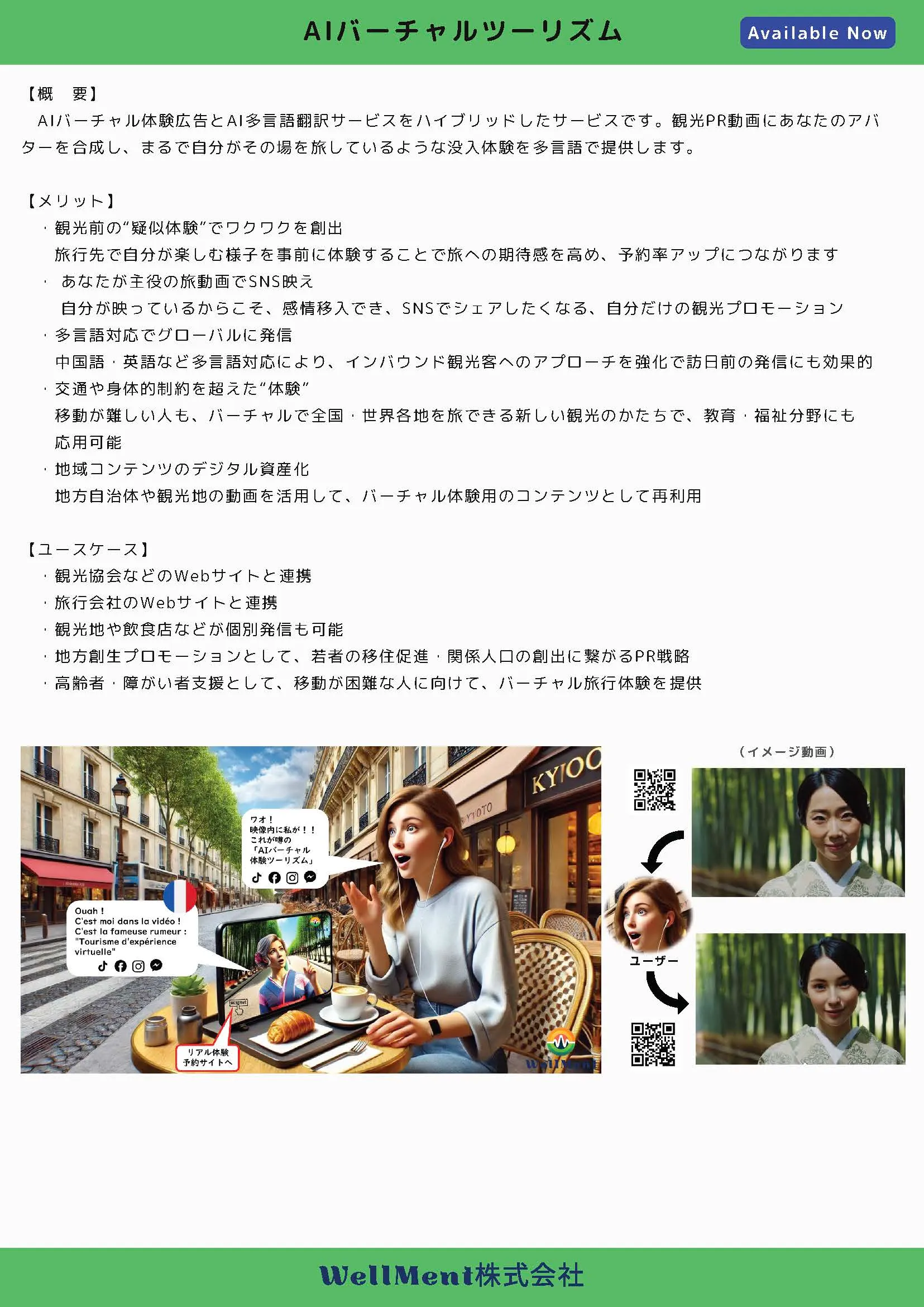 AIキャスターが企業ニュースやPR映像を自動生成。高品質な動画を低コストで継続的に配信できます。・AIバーチャルツーリズム